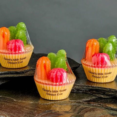 Our Desert Eve Cactus Cupcake is a handmade, all natural soap that is perfect for any room with a cactus theme. This 4oz. soap is scented with our popular Desert Eve (aka Island Citrus) fragrance, making it a great gift for any occasion. Not only does it look and smell amazing, but it's also a great décor item to spruce up any room. Try our Desert Eve Cactus Cupcake today.