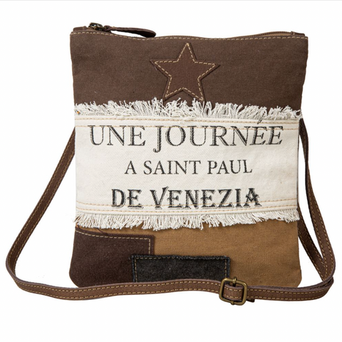An air of travel with an international, French influence gives this delightful bag its charm. Canvas patchwork designs, with fanciful accents and wording, complete the look. Interior features zipper-close top; back is matching woven canvas with added zippered pocket. Durable, removable adjustable shoulder strap in matching leather.