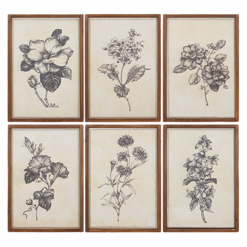 These lovely framed prints were designed by artist Patricia Nugent... there are six assorted images, each one features its own individual flower that would look amazing as a stand-alone or hang multiple as a collection. The color scheme is neutral with its natural wood frame, white and cream print.