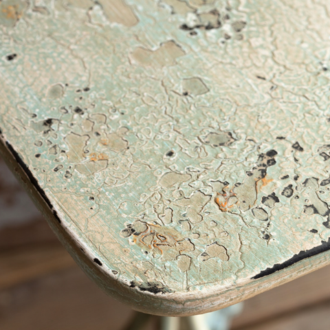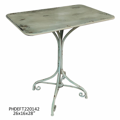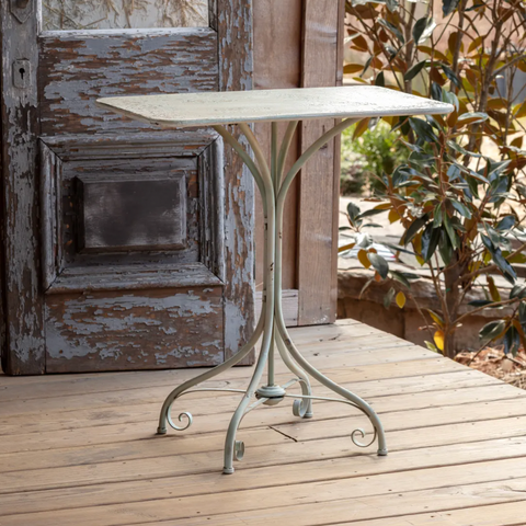 The Mississippi Porch Table has a light metal construction and a warm antique white washed finish. It can lighten a number of spaces in the home.