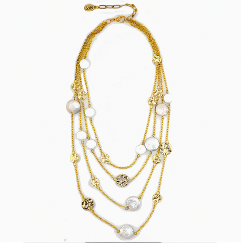 Made in the USA! Our Cornucopia Necklace is an adorable combination of pearls and hammered disks on delicate cable chain.