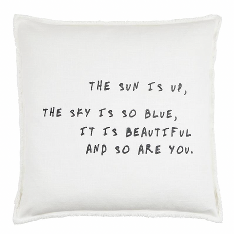 Words written on fabric that will make you think of sweet things of consequence. Our The Sun is Up 26" Pillow is square with a down insert. Each of these comfy large pillows has a hidden zipper to make cleaning as easy as removing the luxurious duck feather insert.