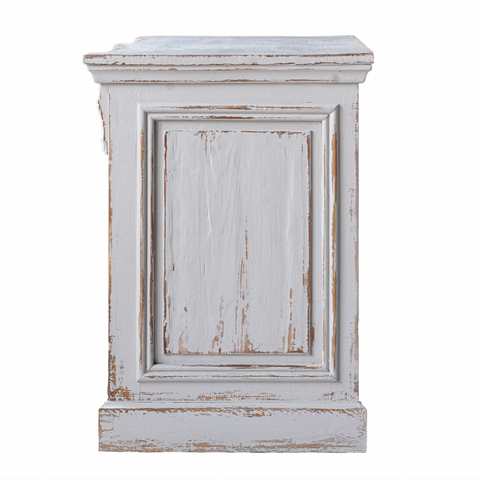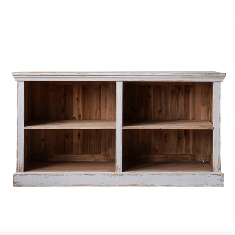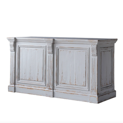 The Dalarna Counter is an upcycled French Country ensemble of furniture featuring beautifully hand-carved details and weathered-looking wood. Each piece is made from grey-washed recycled pine wood, though the top of each piece is more heavily sanded and clear-finished to expose the beauty of the raw wood. Use the Dalarna Counter for in-store displays or for open-room decor. The front is dressed to impress while the back has cubbies made of natural wood and a natural finished shelf.
