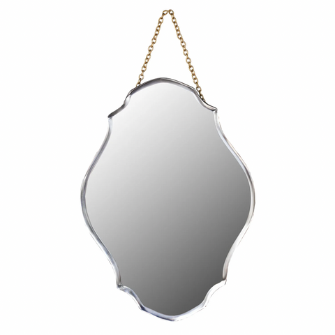 The Elle Medallion Mirror, with its enhanced oval-like shape, features sleek beveled edges and has a wood backing. The small accent mirror has an antique-brass-finished chain for hanging. Hang with other small- and medium-sized mirrors for an intriguing wall display.