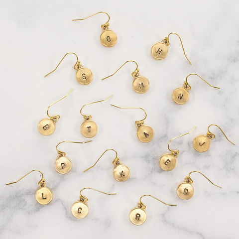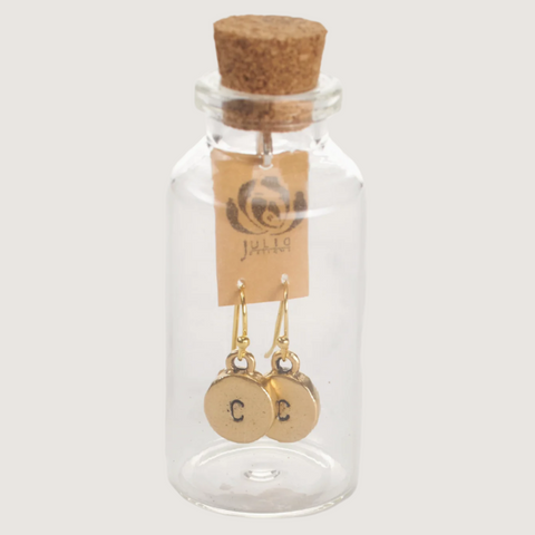 hand stamped initial earrings... each set of earrings is sold in a glass bottle with a little cork closure.