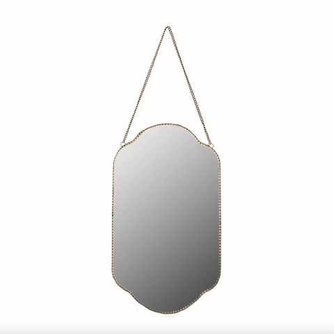 Rectangular with gracefully rounded ends, the Grammercy Mirror, Long, features beveled edges enhanced with antique-brass-finished filigree trim. The small accent mirror is mounted on a wood back and has an antique-brass-finished chain for hanging. Hang with other small- and medium-sized mirrors for an intriguing wall display.