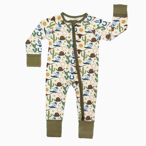 The softest bamboo baby pajamas in our new Howdy western pattern! This fun print full of cacti and cowboy gear is perfect for spring and summer. Check out more with this print for the cutest sibling match, and don't miss our new Hey Y'all western print as well! * SWEET DREAMS: Made from high quality bamboo, our baby pajamas are the recipe for a perfect night's sleep. Our bamboo pajamas start with our signature buttery soft bamboo/spandex blend that has the perfect amount of stretch for the most comfort. * FEATURES: Our two-way zipper design makes late night changes a breeze. Our pajamas include many comfort features, such as fold-over sleeves to keep baby from scratching, fold-over feet to keep toes warm, and printed neck label and neckline zipper protection.