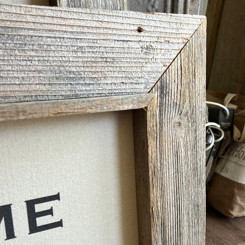 aged wood from Texas, cloth canvas, printed text.
