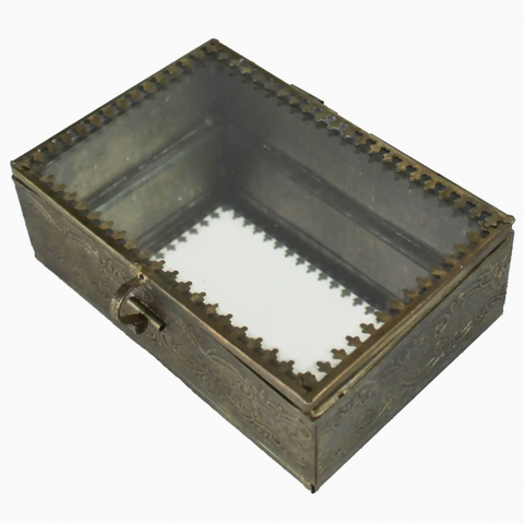 Pressed brass boxes with glass lids and mirrored bottoms offer a petite trinket boxes for jewelry, coins and other finds.