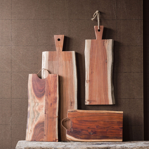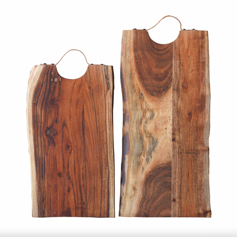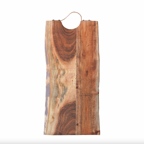 The acacia-wood Leathermans Cutting Board features live edges that retain the natural outline of the tree. Rectangular in shape, the thick plank is naturally finished to showcase the wood's grain and coloration. The top of each board has a semi-circle cutout fitted with a leather strap for hanging. Use decoratively. Available in Small or Large.