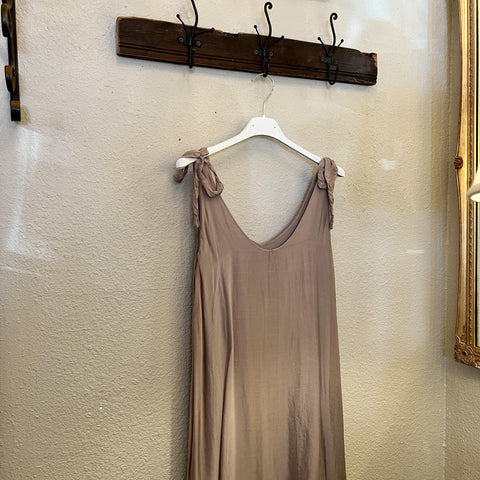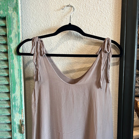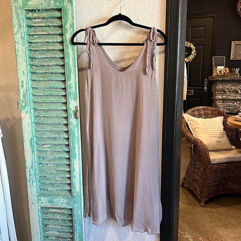 An adorable two layered silk dress that is mid-length. The shoulder straps are adjustable bowties that can be loosened as needed. The silk second layer blows beautifully, and lays just right over the interior Viscose lining.