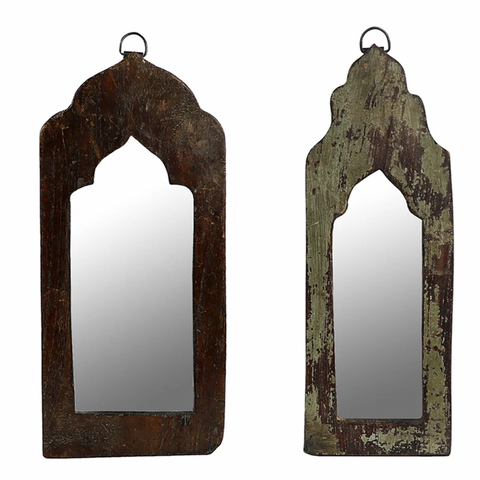 A handcrafted reinterpretation of a vintage design, we’ve hand-chosen recycled siding from village homes across India and repurposed it into frames for a rustic accessory. Paint and patina are original on each mirror. Size & design vary.
