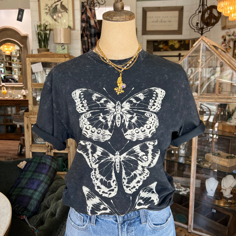 Our Butterfly Trio Graphic Tee is mineral washed, and comes in the color vintage Black. It is a short sleeve crew neck graphic tee, loose in all the right places. Featuring an open neckline with slightly dropped sleeves. Made with soft 100% cotton fabrication, this graphic is an original design, and screen printed.