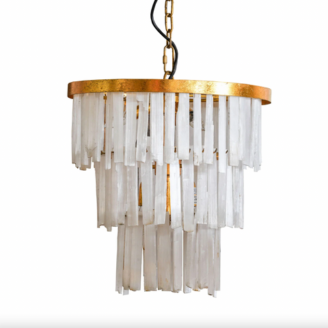 With three water-falling rows of rectangular raw selenite stone for its shade, the 3-Tier Selenite Chandelier is a showstopper. The luminous white stones hang from bronze powder-coated hooks and frame. The large, circular chandelier is suspended from a chain-link strand for easy height adjustment. The 3-Tier Alabaster Chandelier holds 5 type B bulbs. Max. 40 watt.