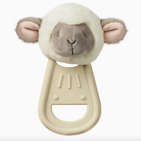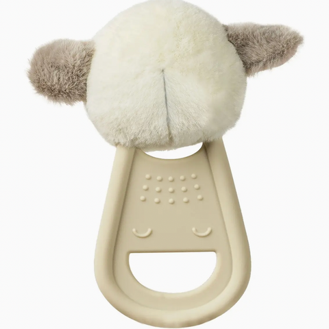 Baby teething toy with adorable stuffed animal lamb, measures 6" in length. This flexible and smooth sewn-in molded teether is food-safe, hygienic and germ resistant.