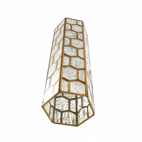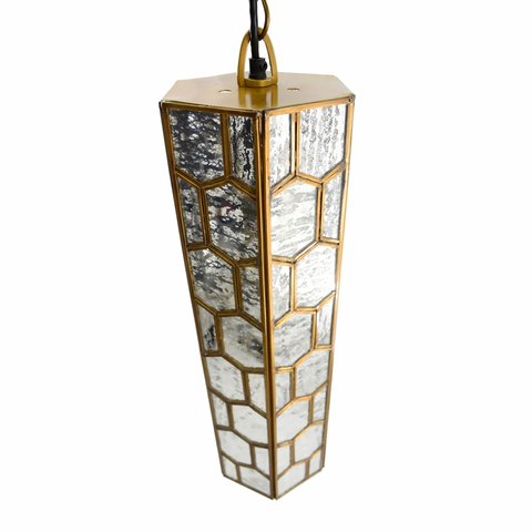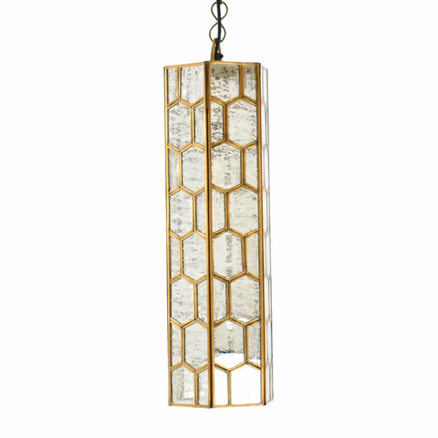 The Sophisticate Pendant gold has a modern meets 1970s appeal. The hexagonal, antique glass panes of the enclosed "shade" cast an ambient hue, while the brass-finished metal frame adds a touch of dazzle. The long Sophisticate Pendant is 22 inches tall and 6 inches in diameter. It holds one 40-watt E26 bulb and has an optional black velvet sleeve for the chain.