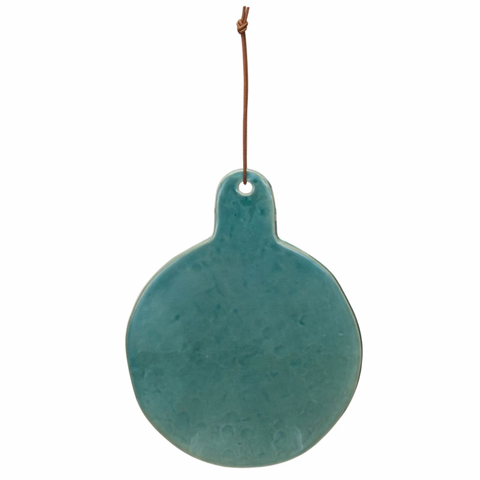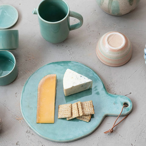 our Stoneware Cheese Board is absolutely adorable... it has a single handle with leather tie, a beautiful reactive crackle glaze in the color aqua. (Each One Will Vary)