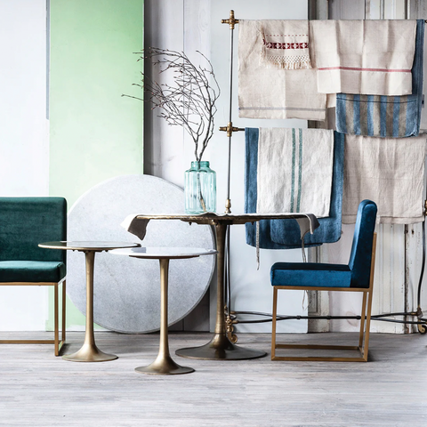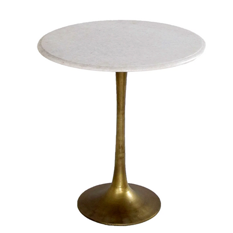 You could just as easily find these chic tables at a sidewalk café, a hotel lobby or your own living room with their timeless design. This table is brass-plated metal base and a bull-nosed marble top.
