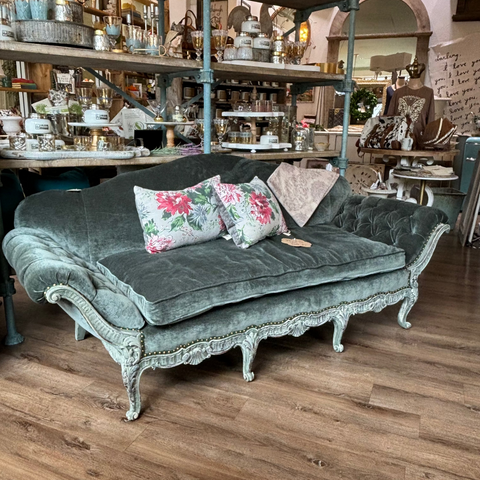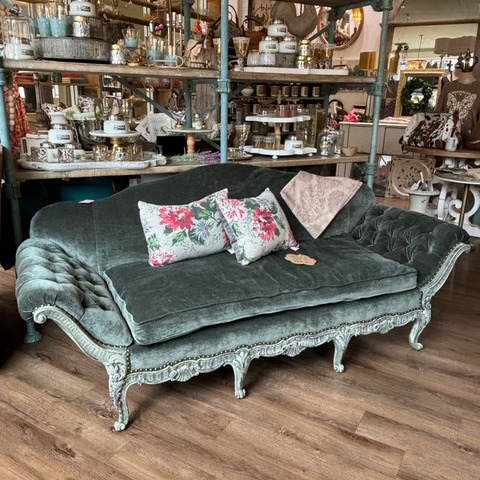 Vintage inspired velvet sofa.  This piece is totally re-worked and re-built with a new cushion.  It has been upholstered with teal velvet.  It is one of a kind.