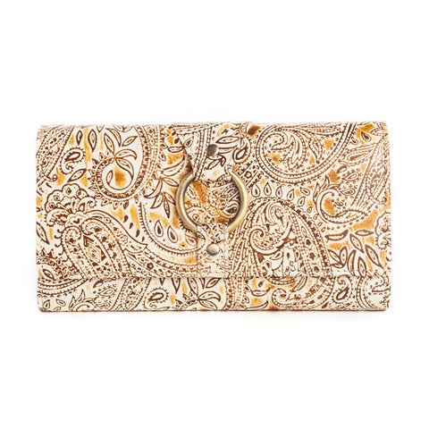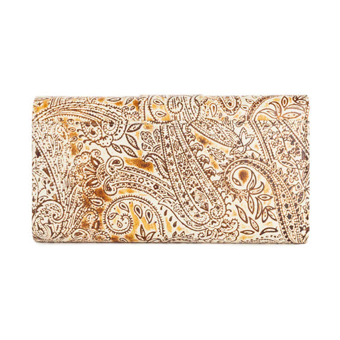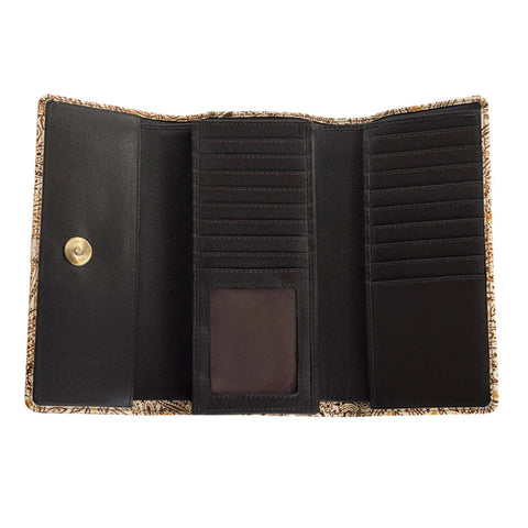Indulge your inner fashionista with this gorgeous wallet: a stunning blend of Southwestern charm and modern elegance. The exterior showcases intricate paisley embossing in warm desert tones, adorned with a classic brass ring closure. Inside, sleek black leather offers ample card slots and a handy ID window. This versatile accessory effortlessly transitions from casual daytime adventures to sophisticated evening outings. Snaps closed.